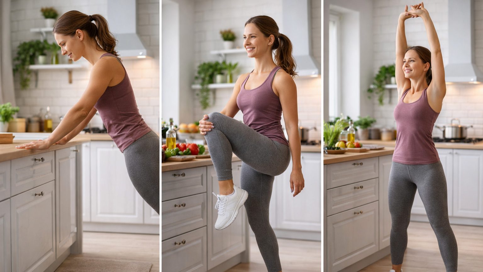 Разминка помогает подготовить суставы и мышцы к нагрузке, даже если она будет легкой. Встаньте лицом к столешнице, положите на нее руки и выполните круговые движения плечами, мягкие наклоны головы, вращения кистями. Затем сделайте несколько медленных перекатов с пятки на носок, пару неглубоких приседаний, удерживая опору, и легкие повороты корпуса. Такой подготовке достаточно 1–2 минут, чтобы перейти к более активным упражнениям на кухне.